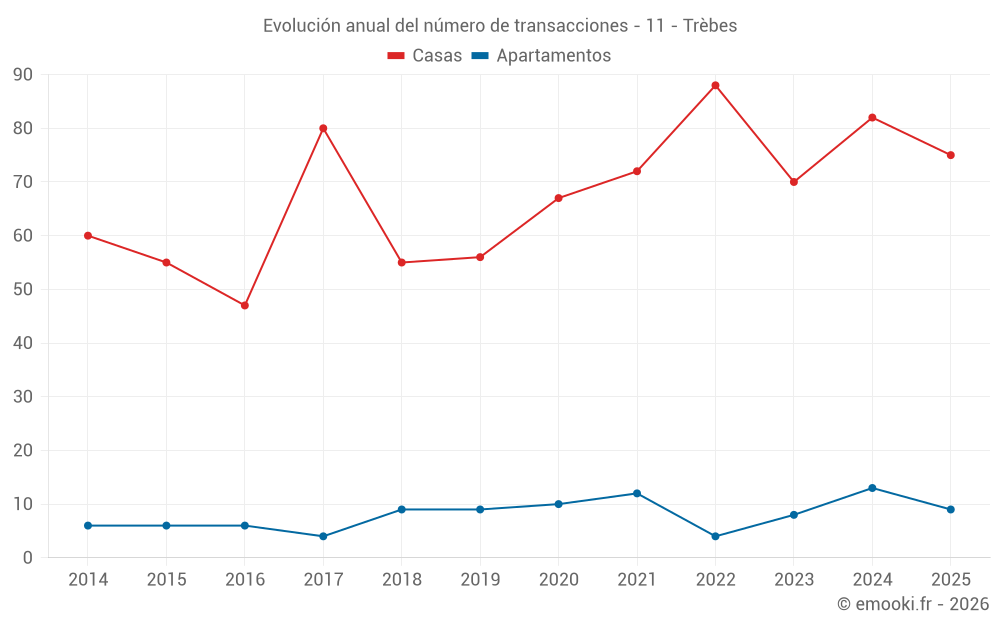 El precio mediano en las 22 transacciones de apartamentos de los últimos 24 meses en la comuna de Trèbes fue de 656 € por metro cuadrado para un valor patrimonial medio de 53 720 €. Durante este período el 60% de las transacciones estuvieron entre 585 y 1 194 € por metro cuadrado (del 2º al 8º decil).