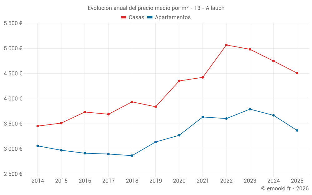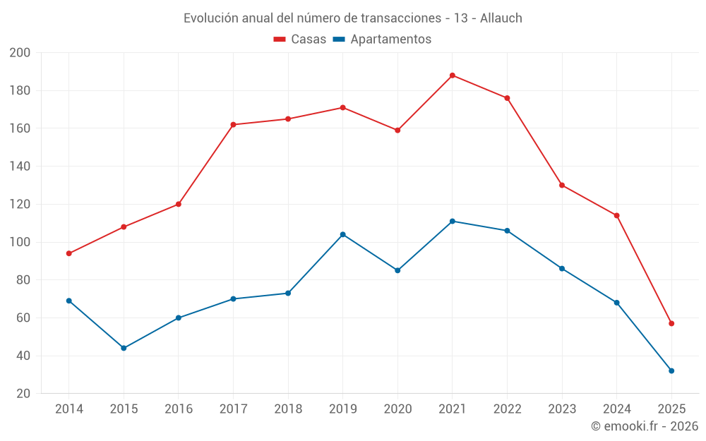 El precio mediano en las 22 transacciones de casas de los últimos 3 meses en la comuna de Allauch fue de 4 725 € por metro cuadrado para un valor patrimonial medio de 464 975 €. Durante este período el 60% de las transacciones estuvieron entre 3 787 y 5 491 € por metro cuadrado (del 2º al 8º decil).