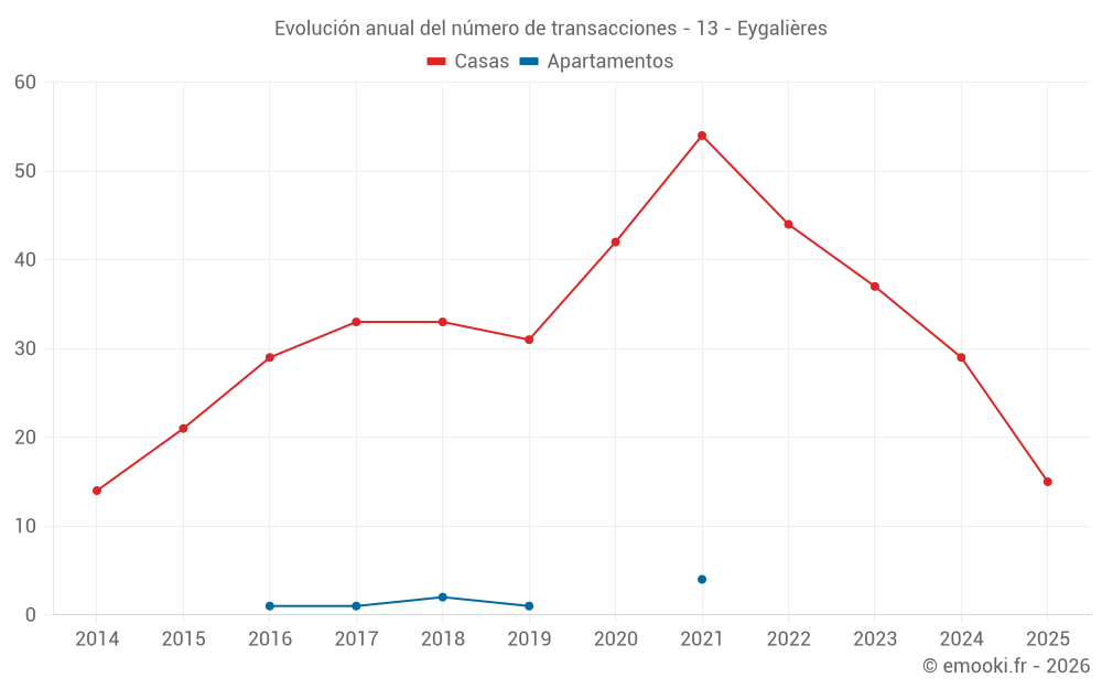 El precio mediano en las 30 transacciones de casas de los últimos 12 meses en la comuna de Eygalières fue de 8 239 € por metro cuadrado para un valor patrimonial medio de 1 550 000 €. Durante este período el 60% de las transacciones estuvieron entre 4 554 y 11 783 € por metro cuadrado (del 2º al 8º decil).