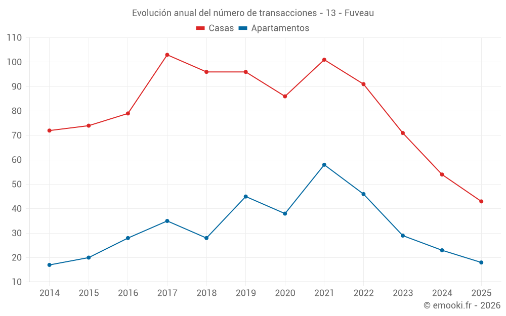 El precio mediano en las 18 transacciones de apartamentos de los últimos 6 meses en la comuna de Fuveau fue de 4 388 € por metro cuadrado para un valor patrimonial medio de 221 000 €. Durante este período el 60% de las transacciones estuvieron entre 3 259 y 4 773 € por metro cuadrado (del 2º al 8º decil).