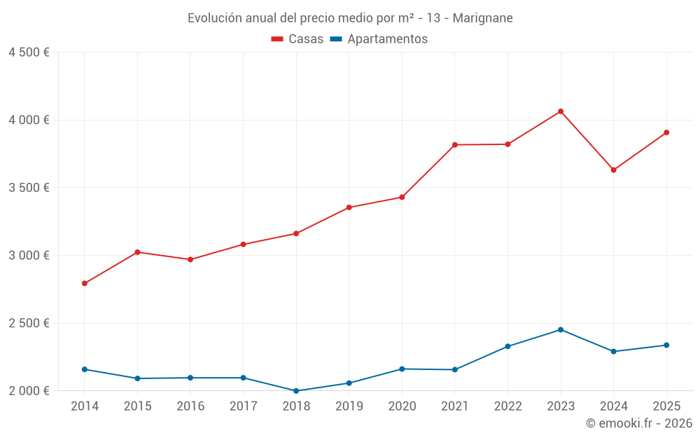 El precio mediano en las 32 transacciones de casas de los últimos 3 meses en la comuna de Marignane fue de 3 836 € por metro cuadrado para un valor patrimonial medio de 361 000 €. Durante este período el 60% de las transacciones estuvieron entre 3 023 y 4 514 € por metro cuadrado (del 2º al 8º decil).