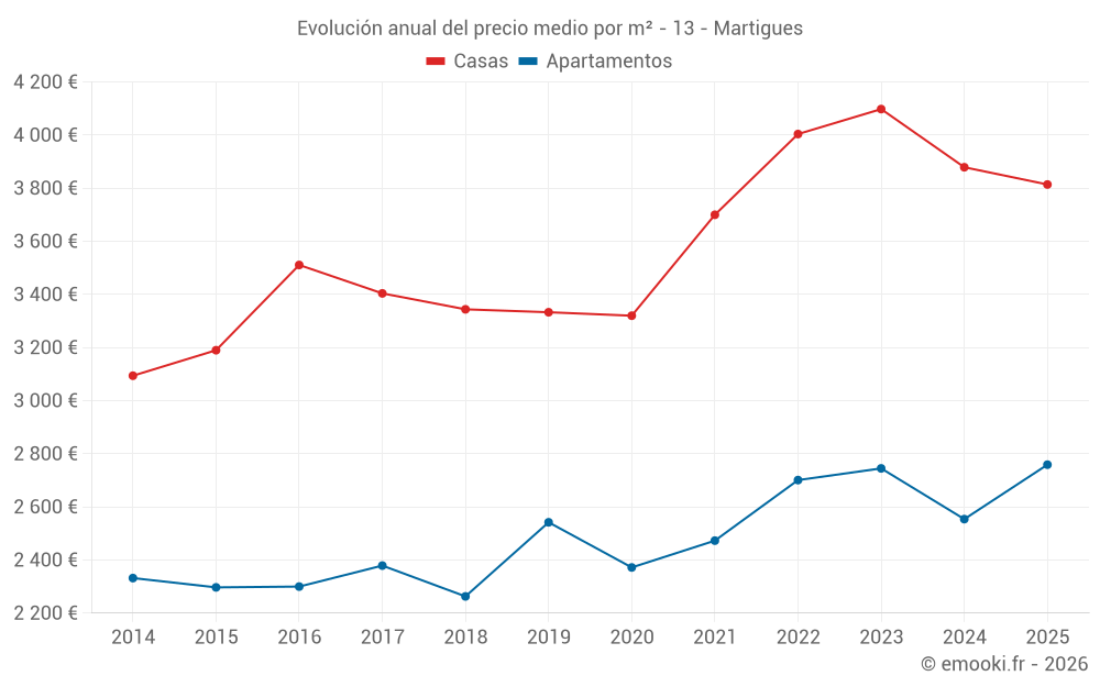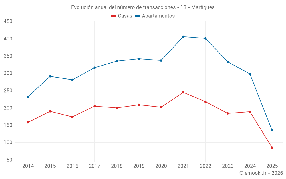 El precio mediano en las 51 transacciones de apartamentos de los últimos 3 meses en la comuna de Martigues fue de 2 759 € por metro cuadrado para un valor patrimonial medio de 160 000 €. Durante este período el 60% de las transacciones estuvieron entre 2 133 y 3 605 € por metro cuadrado (del 2º al 8º decil).