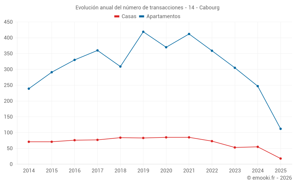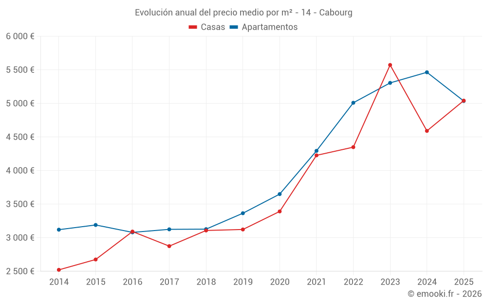 El precio mediano en las 51 transacciones de apartamentos de los últimos 3 meses en la comuna de Cabourg fue de 5 056 € por metro cuadrado para un valor patrimonial medio de 143 500 €. Durante este período el 60% de las transacciones estuvieron entre 4 034 y 6 124 € por metro cuadrado (del 2º al 8º decil).
