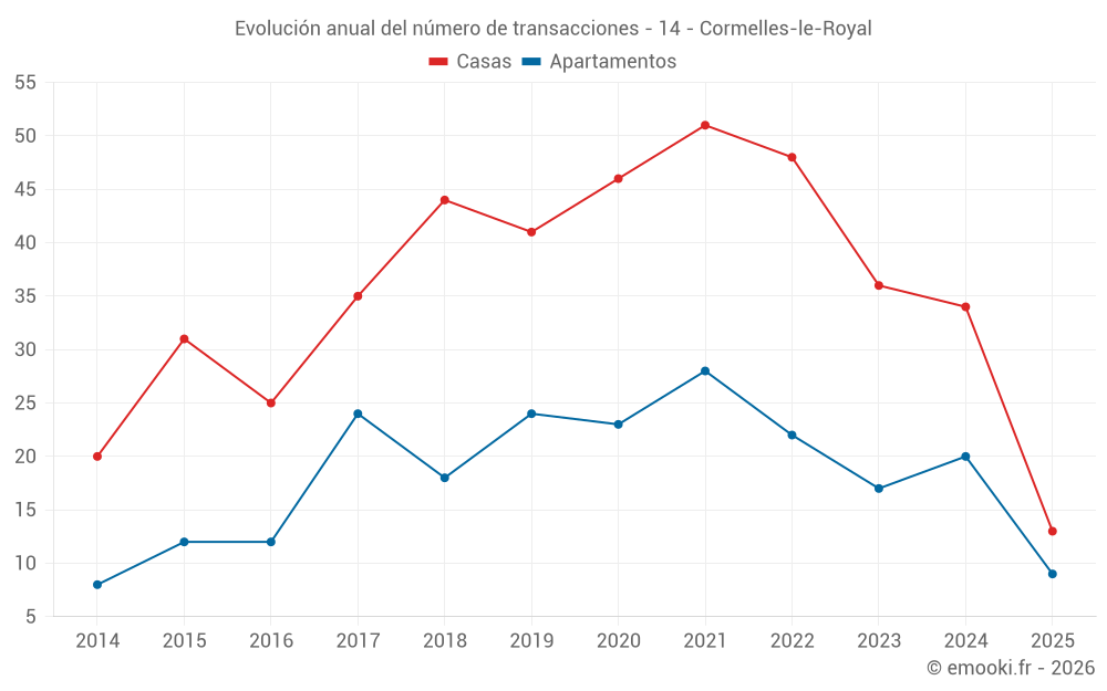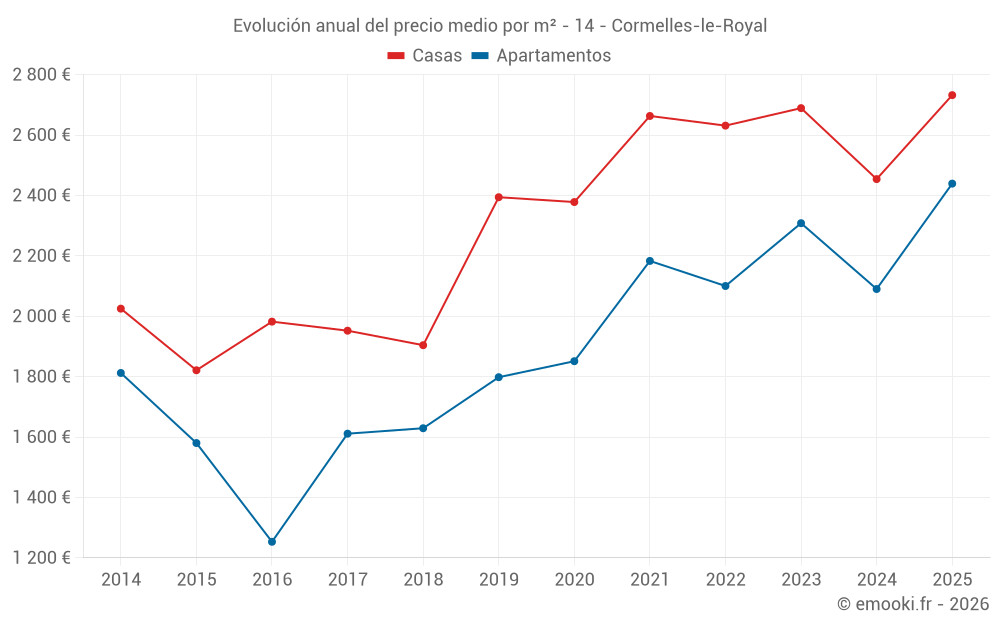 El precio mediano en las 17 transacciones de apartamentos de los últimos 12 meses en la comuna de Cormelles-le-Royal fue de 2 246 € por metro cuadrado para un valor patrimonial medio de 91 900 €. Durante este período el 60% de las transacciones estuvieron entre 1 961 y 2 608 € por metro cuadrado (del 2º al 8º decil).