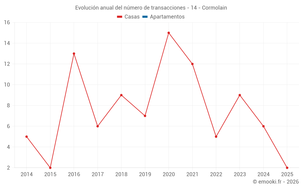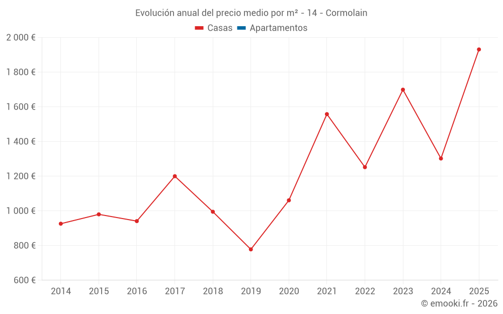 El precio mediano en las 14 transacciones de casas de los últimos 24 meses en la comuna de Cormolain fue de 1 460 € por metro cuadrado para un valor patrimonial medio de 127 140 €. Durante este período el 60% de las transacciones estuvieron entre 1 256 y 1 747 € por metro cuadrado (del 2º al 8º decil).