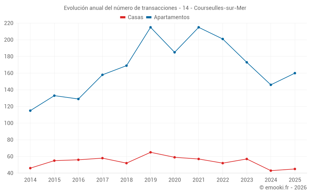 El precio mediano en las 27 transacciones de apartamentos de los últimos 3 meses en la comuna de Courseulles-sur-Mer fue de 3 666 € por metro cuadrado para un valor patrimonial medio de 110 000 €. Durante este período el 60% de las transacciones estuvieron entre 2 789 y 4 218 € por metro cuadrado (del 2º al 8º decil).