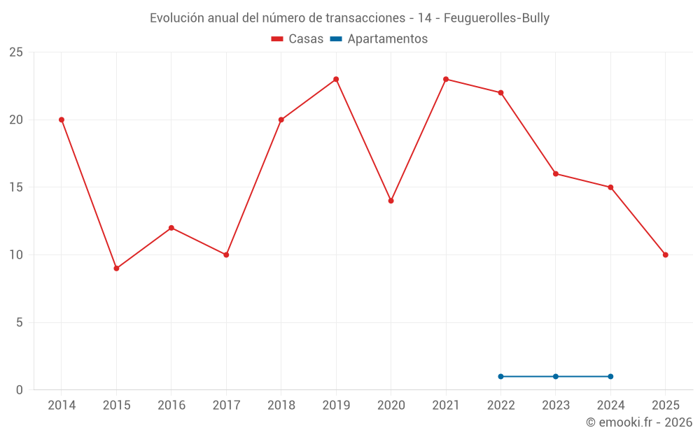 El precio mediano en las 21 transacciones de casas de los últimos 12 meses en la comuna de Feuguerolles-Bully fue de 2 759 € por metro cuadrado para un valor patrimonial medio de 271 500 €. Durante este período el 60% de las transacciones estuvieron entre 2 055 y 2 888 € por metro cuadrado (del 2º al 8º decil).
