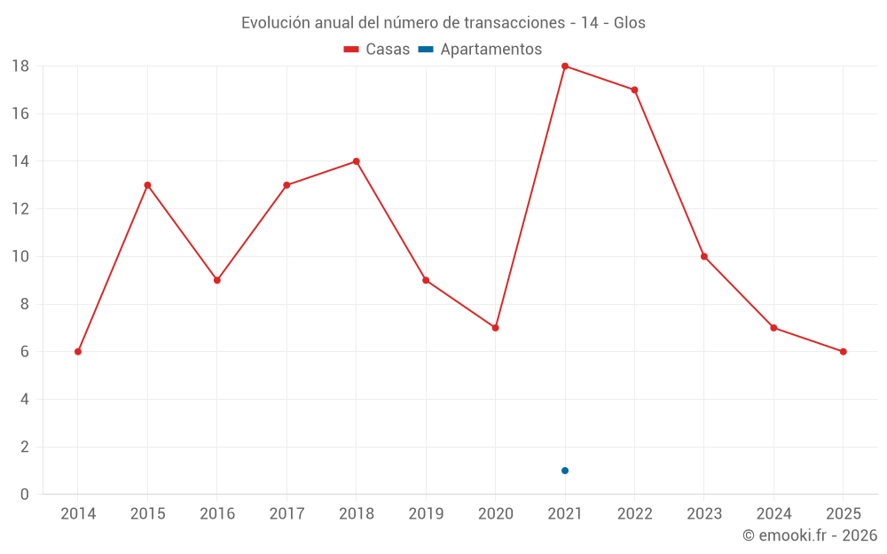 El precio mediano en las 19 transacciones de casas de los últimos 24 meses en la comuna de Glos fue de 1 755 € por metro cuadrado para un valor patrimonial medio de 199 900 €. Durante este período el 60% de las transacciones estuvieron entre 1 335 y 2 016 € por metro cuadrado (del 2º al 8º decil).