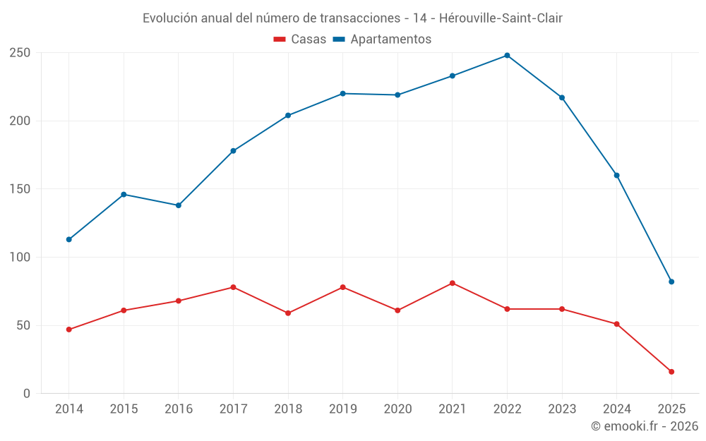El precio mediano en las 33 transacciones de apartamentos de los últimos 3 meses en la comuna de Hérouville-Saint-Clair fue de 1 741 € por metro cuadrado para un valor patrimonial medio de 106 500 €. Durante este período el 60% de las transacciones estuvieron entre 1 477 y 2 785 € por metro cuadrado (del 2º al 8º decil).