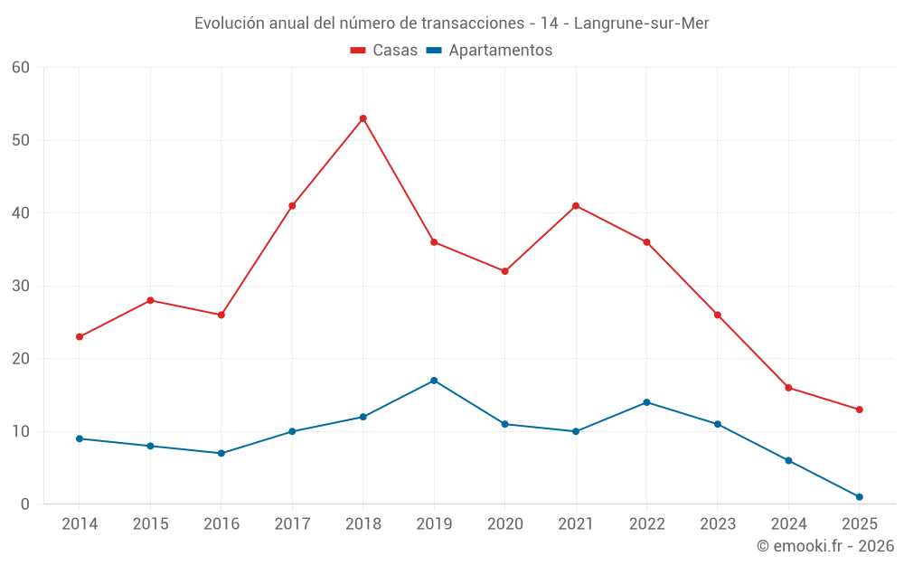 El precio mediano en las 20 transacciones de casas de los últimos 12 meses en la comuna de Langrune-sur-Mer fue de 3 412 € por metro cuadrado para un valor patrimonial medio de 217 355 €. Durante este período el 60% de las transacciones estuvieron entre 2 865 y 4 104 € por metro cuadrado (del 2º al 8º decil).