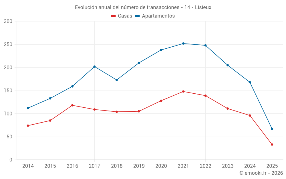 El precio mediano en las 32 transacciones de apartamentos de los últimos 3 meses en la comuna de Lisieux fue de 1 676 € por metro cuadrado para un valor patrimonial medio de 106 500 €. Durante este período el 60% de las transacciones estuvieron entre 1 290 y 2 257 € por metro cuadrado (del 2º al 8º decil).