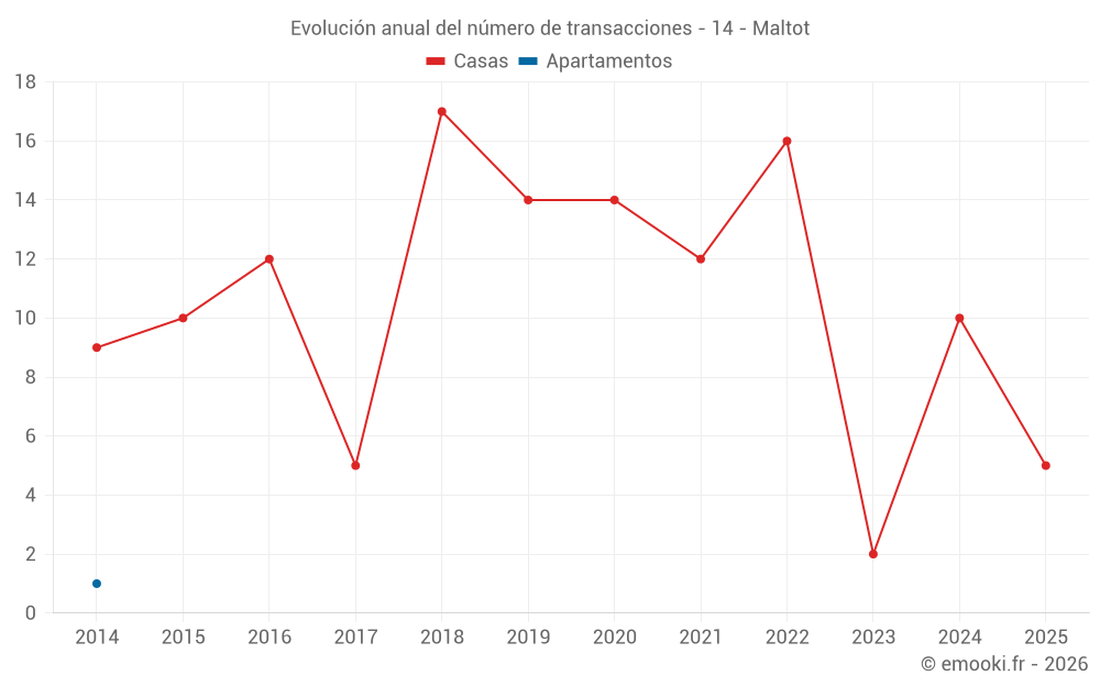 El precio mediano en las 17 transacciones de casas de los últimos 24 meses en la comuna de Maltot fue de 2 706 € por metro cuadrado para un valor patrimonial medio de 273 000 €. Durante este período el 60% de las transacciones estuvieron entre 2 525 y 2 929 € por metro cuadrado (del 2º al 8º decil).