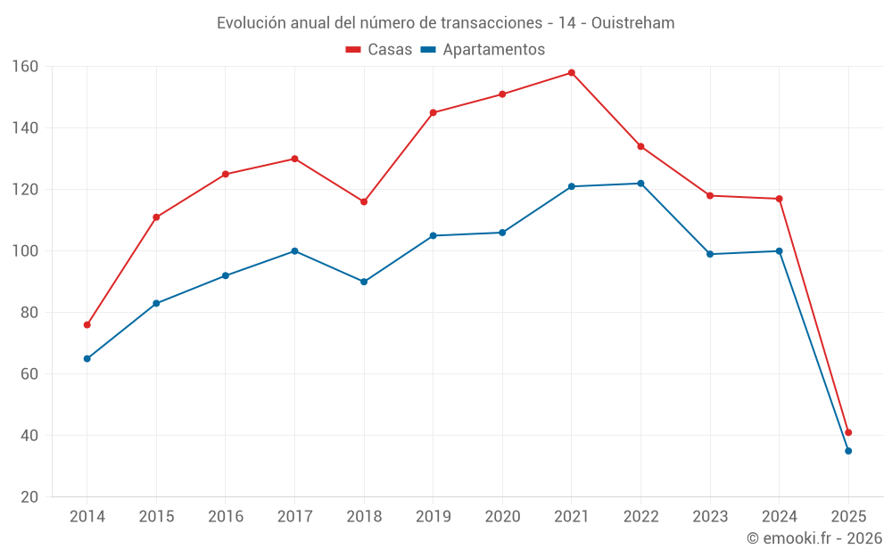 El precio mediano en las 35 transacciones de apartamentos de los últimos 6 meses en la comuna de Ouistreham fue de 3 625 € por metro cuadrado para un valor patrimonial medio de 126 000 €. Durante este período el 60% de las transacciones estuvieron entre 2 723 y 4 216 € por metro cuadrado (del 2º al 8º decil).
