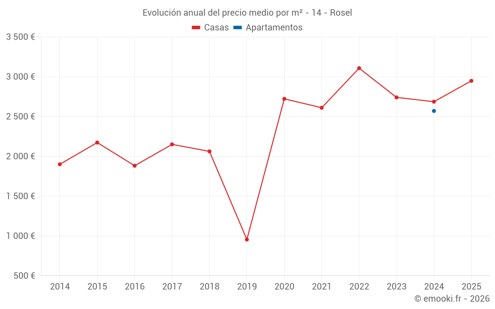El precio mediano en las 14 transacciones de casas de los últimos 24 meses en la comuna de Rosel fue de 2 706 € por metro cuadrado para un valor patrimonial medio de 339 900 €. Durante este período el 60% de las transacciones estuvieron entre 2 250 y 3 258 € por metro cuadrado (del 2º al 8º decil).