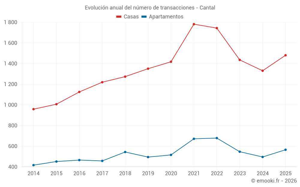 El precio mediano en las 164 transacciones de apartamentos de los últimos 3 meses en el departamento de Cantal fue de 1 288 € por metro cuadrado para un valor patrimonial medio de 75 000 €. Durante este período el 60% de las transacciones estuvieron entre 679 y 1 722 € por metro cuadrado (del 2º al 8º decil).