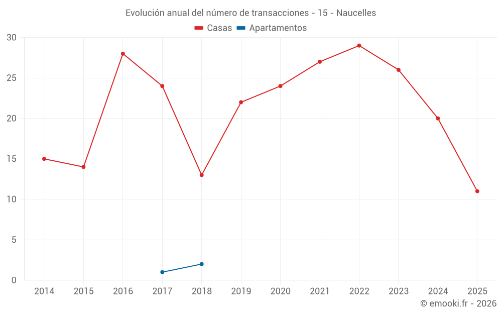 El precio mediano en las 23 transacciones de casas de los últimos 12 meses en la comuna de Naucelles fue de 1 732 € por metro cuadrado para un valor patrimonial medio de 173 500 €. Durante este período el 60% de las transacciones estuvieron entre 1 111 y 2 210 € por metro cuadrado (del 2º al 8º decil).