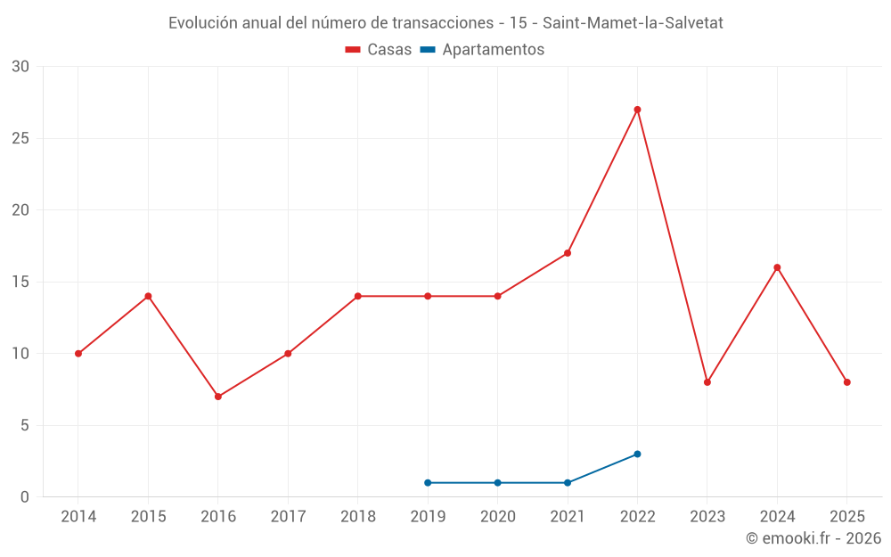 El precio mediano en las 17 transacciones de casas de los últimos 12 meses en la comuna de Saint-Mamet-la-Salvetat fue de 1 386 € por metro cuadrado para un valor patrimonial medio de 133 840 €. Durante este período el 60% de las transacciones estuvieron entre 1 085 y 1 937 € por metro cuadrado (del 2º al 8º decil).