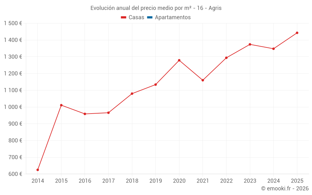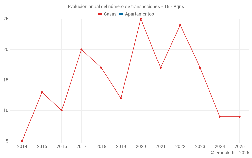 El precio mediano en las 18 transacciones de casas de los últimos 12 meses en la comuna de Agris fue de 1 396 € por metro cuadrado para un valor patrimonial medio de 115 050 €. Durante este período el 60% de las transacciones estuvieron entre 855 y 1 706 € por metro cuadrado (del 2º al 8º decil).