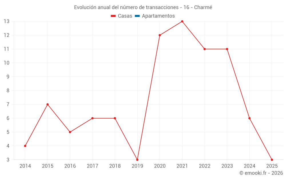 El precio mediano en las 15 transacciones de casas de los últimos 24 meses en la comuna de Charmé fue de 867 € por metro cuadrado para un valor patrimonial medio de 70 000 €. Durante este período el 60% de las transacciones estuvieron entre 343 y 1 087 € por metro cuadrado (del 2º al 8º decil).