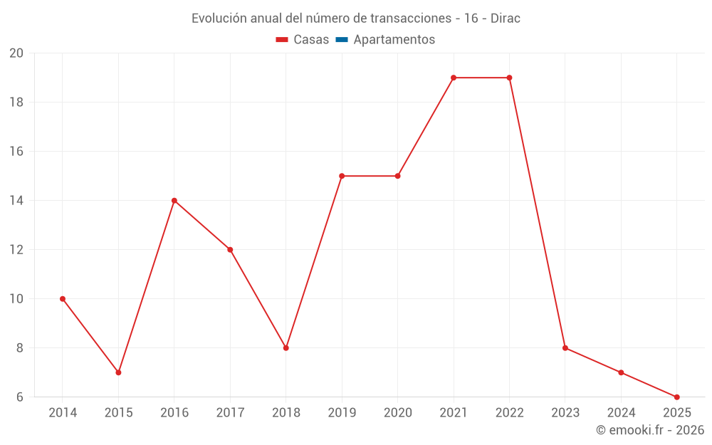El precio mediano en las 16 transacciones de casas de los últimos 24 meses en la comuna de Dirac fue de 1 793 € por metro cuadrado para un valor patrimonial medio de 189 500 €. Durante este período el 60% de las transacciones estuvieron entre 1 055 y 2 025 € por metro cuadrado (del 2º al 8º decil).
