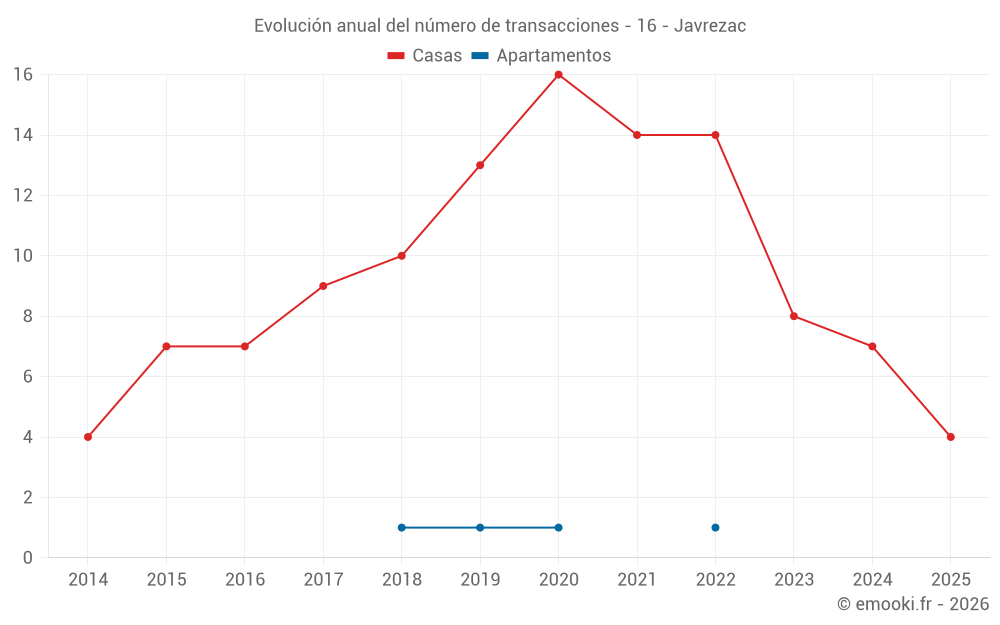 El precio mediano en las 14 transacciones de casas de los últimos 24 meses en la comuna de Javrezac fue de 1 282 € por metro cuadrado para un valor patrimonial medio de 105 000 €. Durante este período el 60% de las transacciones estuvieron entre 772 y 1 939 € por metro cuadrado (del 2º al 8º decil).