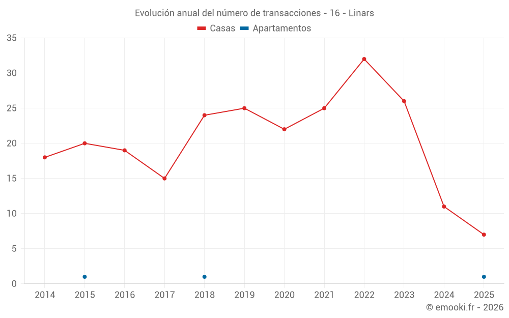 El precio mediano en las 16 transacciones de casas de los últimos 12 meses en la comuna de Linars fue de 1 594 € por metro cuadrado para un valor patrimonial medio de 152 266 €. Durante este período el 60% de las transacciones estuvieron entre 1 383 y 1 908 € por metro cuadrado (del 2º al 8º decil).
