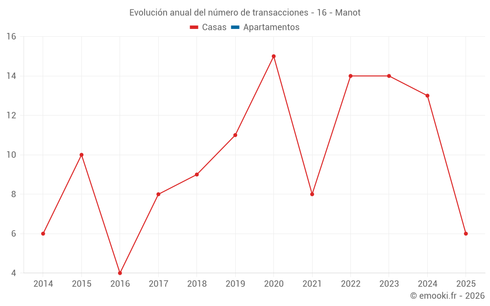 El precio mediano en las 17 transacciones de casas de los últimos 12 meses en la comuna de Manot fue de 909 € por metro cuadrado para un valor patrimonial medio de 78 700 €. Durante este período el 60% de las transacciones estuvieron entre 682 y 1 319 € por metro cuadrado (del 2º al 8º decil).