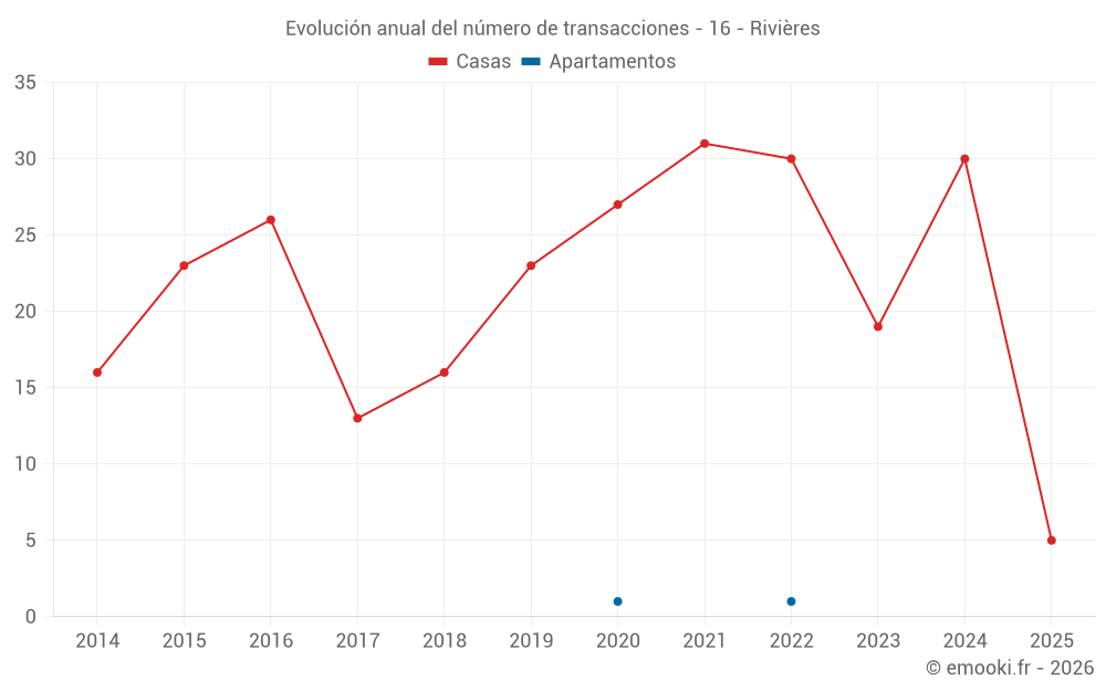 El precio mediano en las 22 transacciones de casas de los últimos 12 meses en la comuna de Rivières fue de 1 644 € por metro cuadrado para un valor patrimonial medio de 150 000 €. Durante este período el 60% de las transacciones estuvieron entre 1 245 y 1 798 € por metro cuadrado (del 2º al 8º decil).
