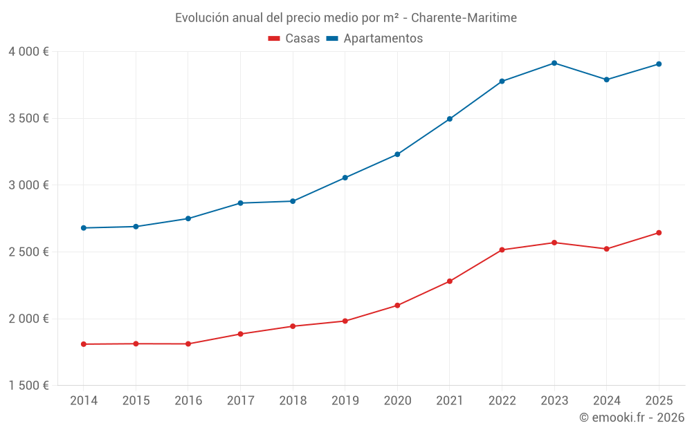 El precio mediano en las 263 transacciones de apartamentos de los últimos 3 meses en el departamento de Charente-Maritime fue de 3 913 € por metro cuadrado para un valor patrimonial medio de 168 000 €. Durante este período el 60% de las transacciones estuvieron entre 2 346 y 5 290 € por metro cuadrado (del 2º al 8º decil).
