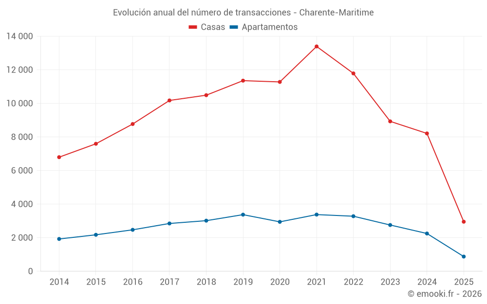 El precio mediano en las 792 transacciones de casas de los últimos 3 meses en el departamento de Charente-Maritime fue de 2 976 € por metro cuadrado para un valor patrimonial medio de 249 800 €. Durante este período el 60% de las transacciones estuvieron entre 1 632 y 4 363 € por metro cuadrado (del 2º al 8º decil).