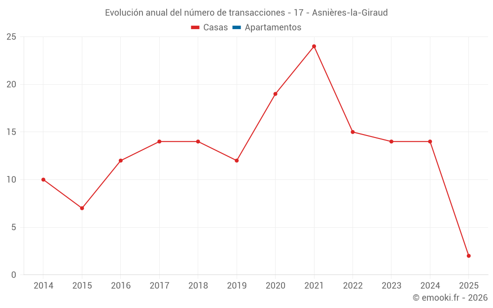 El precio mediano en las 25 transacciones de casas de los últimos 24 meses en la comuna de Asnières-la-Giraud fue de 1 323 € por metro cuadrado para un valor patrimonial medio de 136 000 €. Durante este período el 60% de las transacciones estuvieron entre 870 y 2 002 € por metro cuadrado (del 2º al 8º decil).
