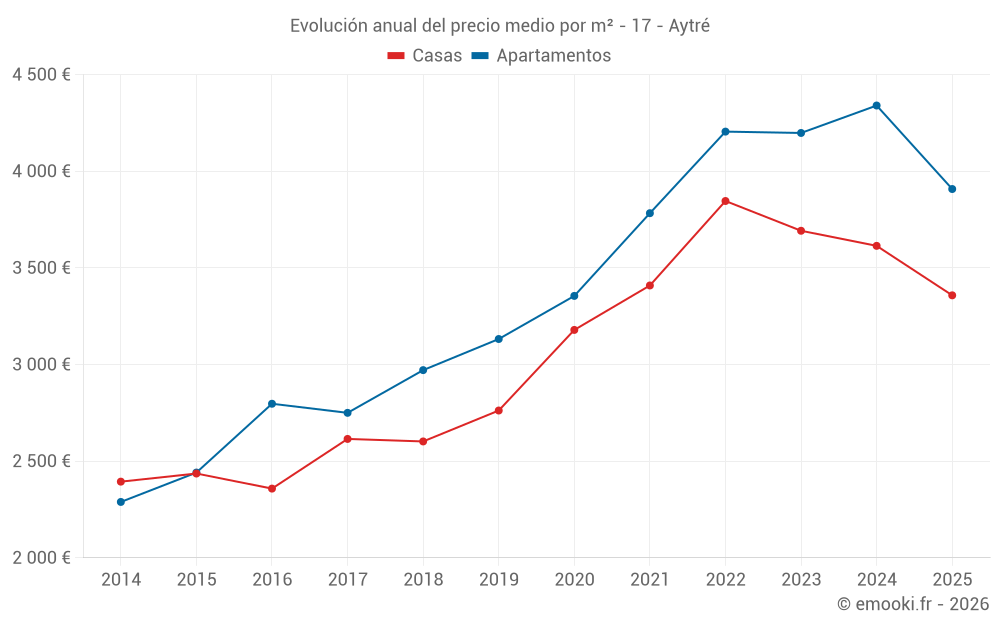 El precio mediano en las 24 transacciones de apartamentos de los últimos 6 meses en la comuna de Aytré fue de 3 908 € por metro cuadrado para un valor patrimonial medio de 184 803 €. Durante este período el 60% de las transacciones estuvieron entre 3 456 y 4 141 € por metro cuadrado (del 2º al 8º decil).