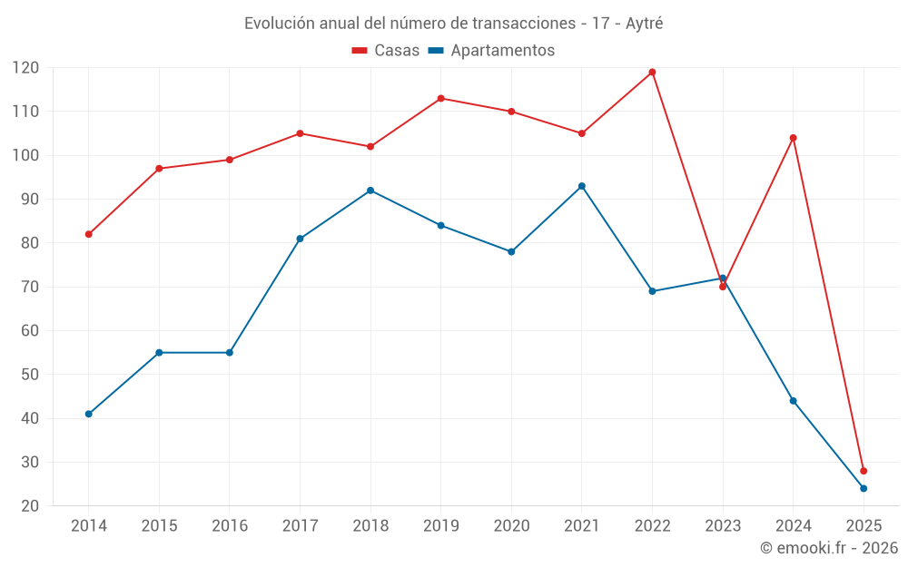 El precio mediano en las 28 transacciones de casas de los últimos 6 meses en la comuna de Aytré fue de 3 358 € por metro cuadrado para un valor patrimonial medio de 293 776 €. Durante este período el 60% de las transacciones estuvieron entre 2 635 y 3 826 € por metro cuadrado (del 2º al 8º decil).