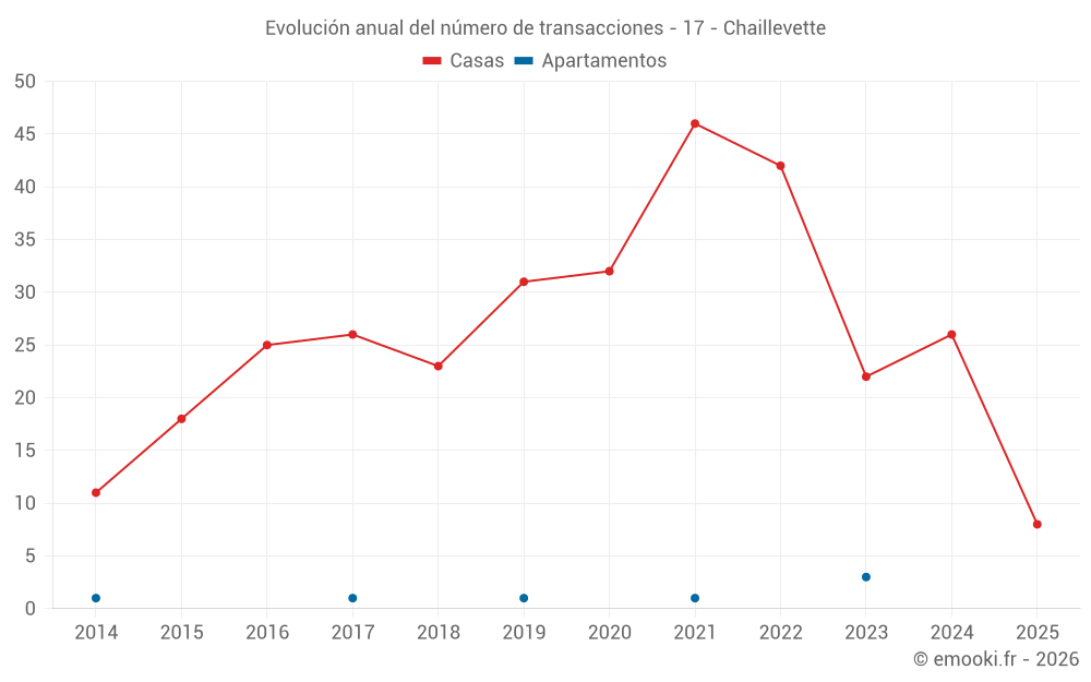 El precio mediano en las 24 transacciones de casas de los últimos 12 meses en la comuna de Chaillevette fue de 2 340 € por metro cuadrado para un valor patrimonial medio de 220 750 €. Durante este período el 60% de las transacciones estuvieron entre 1 627 y 3 045 € por metro cuadrado (del 2º al 8º decil).
