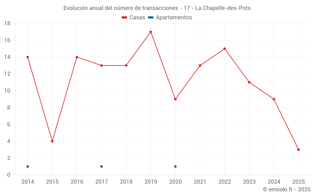 El precio mediano en las 19 transacciones de casas de los últimos 24 meses en la comuna de La Chapelle-des-Pots fue de 1 805 € por metro cuadrado para un valor patrimonial medio de 176 526 €. Durante este período el 60% de las transacciones estuvieron entre 1 153 y 2 323 € por metro cuadrado (del 2º al 8º decil).
