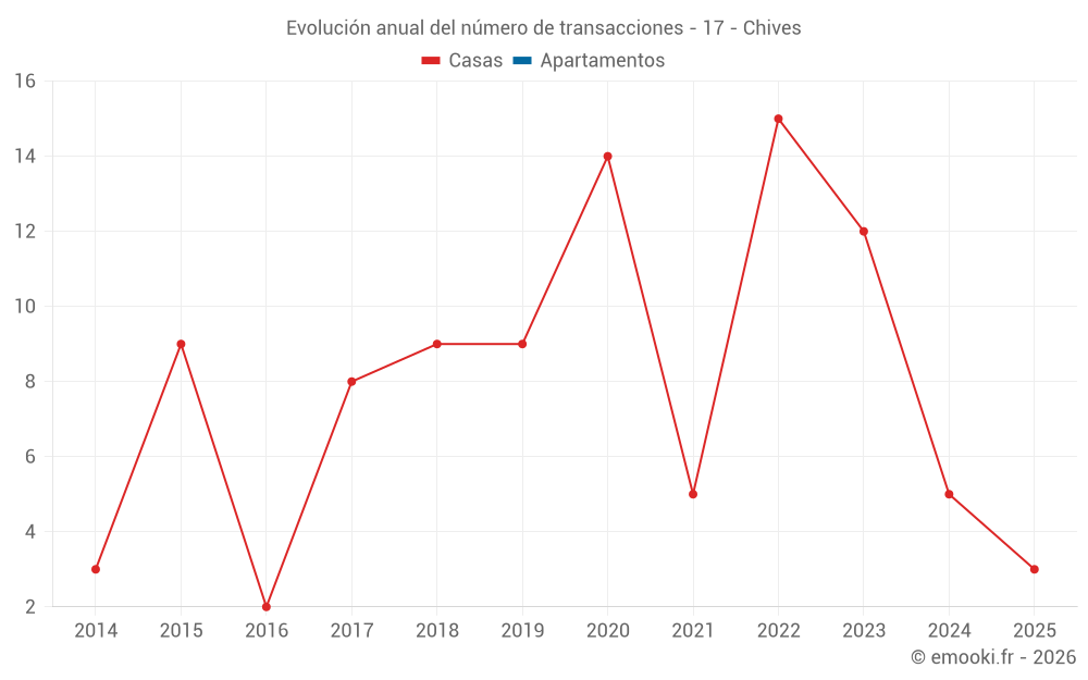 El precio mediano en las 16 transacciones de casas de los últimos 24 meses en la comuna de Chives fue de 1 120 € por metro cuadrado para un valor patrimonial medio de 93 000 €. Durante este período el 60% de las transacciones estuvieron entre 432 y 1 474 € por metro cuadrado (del 2º al 8º decil).