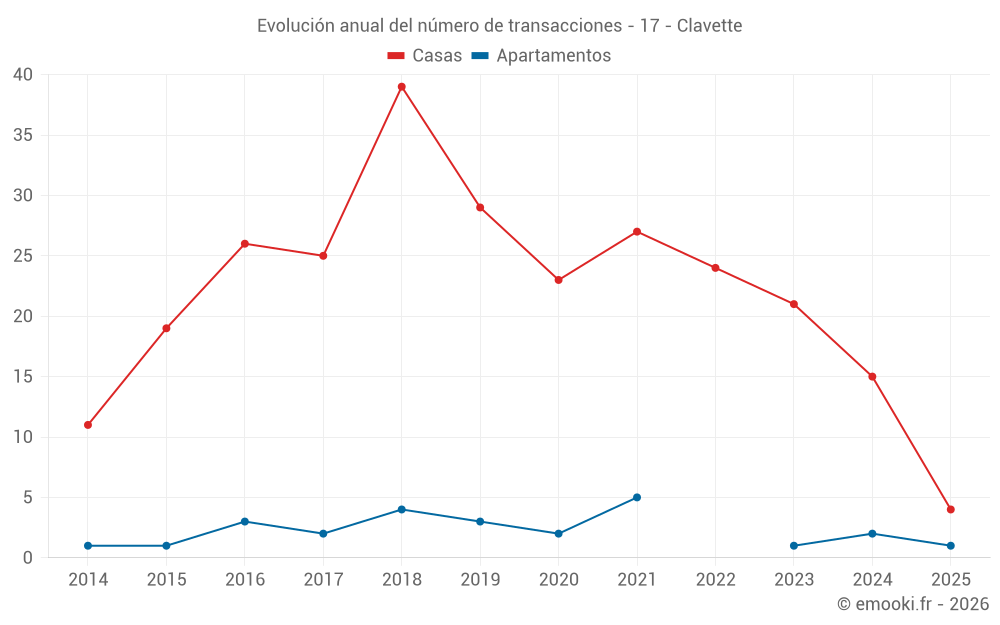 El precio mediano en las 26 transacciones de casas de los últimos 24 meses en la comuna de Clavette fue de 3 332 € por metro cuadrado para un valor patrimonial medio de 379 800 €. Durante este período el 60% de las transacciones estuvieron entre 2 348 y 3 740 € por metro cuadrado (del 2º al 8º decil).
