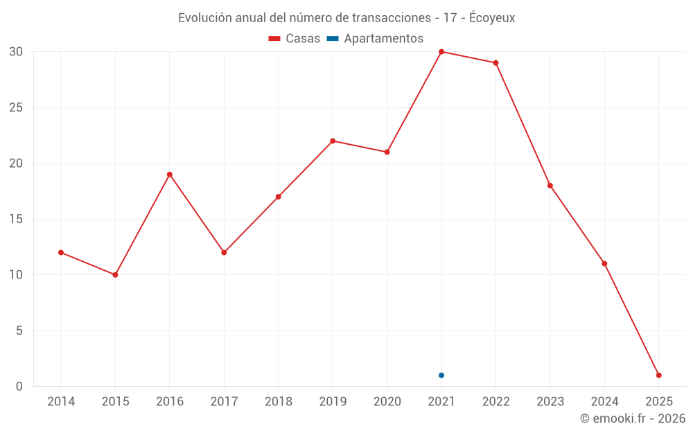 El precio mediano en las 19 transacciones de casas de los últimos 24 meses en la comuna de Écoyeux fue de 1 594 € por metro cuadrado para un valor patrimonial medio de 150 000 €. Durante este período el 60% de las transacciones estuvieron entre 701 y 2 026 € por metro cuadrado (del 2º al 8º decil).