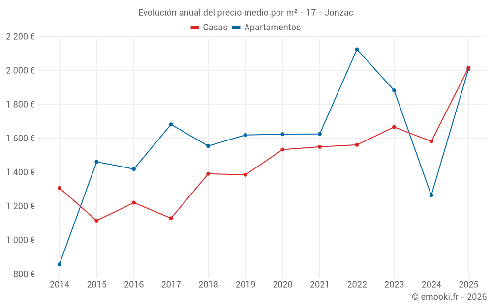 El precio mediano en las 22 transacciones de apartamentos de los últimos 24 meses en la comuna de Jonzac fue de 1 746 € por metro cuadrado para un valor patrimonial medio de 82 000 €. Durante este período el 60% de las transacciones estuvieron entre 1 117 y 2 185 € por metro cuadrado (del 2º al 8º decil).