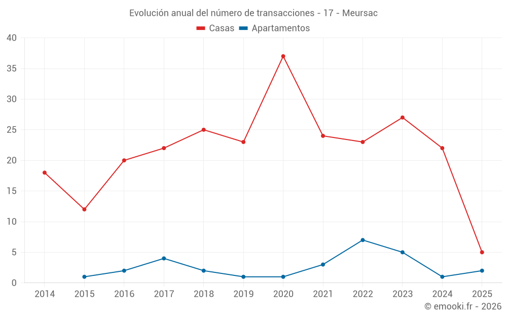 El precio mediano en las 21 transacciones de casas de los últimos 12 meses en la comuna de Meursac fue de 1 838 € por metro cuadrado para un valor patrimonial medio de 195 000 €. Durante este período el 60% de las transacciones estuvieron entre 1 438 y 2 621 € por metro cuadrado (del 2º al 8º decil).