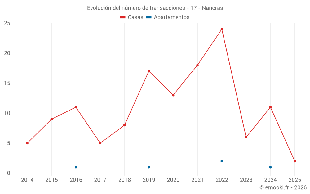 El precio mediano en las 15 transacciones de casas de los últimos 24 meses en la comuna de Nancras fue de 2 082 € por metro cuadrado para un valor patrimonial medio de 190 000 €. Durante este período el 60% de las transacciones estuvieron entre 1 800 y 2 713 € por metro cuadrado (del 2º al 8º decil).