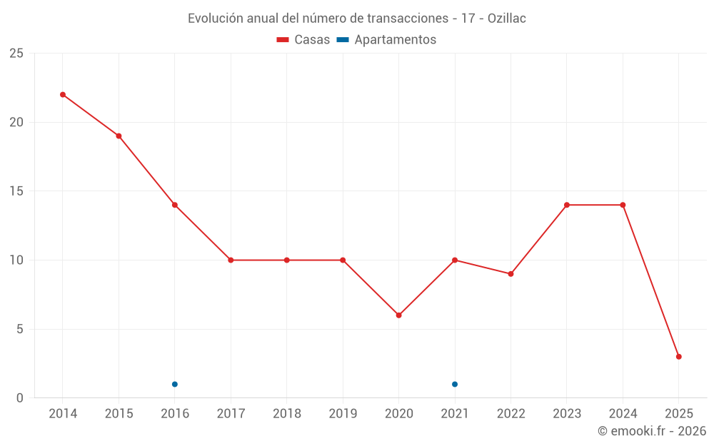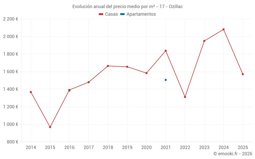 El precio mediano en las 23 transacciones de casas de los últimos 24 meses en la comuna de Ozillac fue de 2 008 € por metro cuadrado para un valor patrimonial medio de 84 005 €. Durante este período el 60% de las transacciones estuvieron entre 1 457 y 2 316 € por metro cuadrado (del 2º al 8º decil).