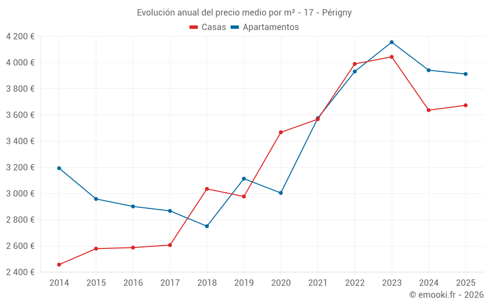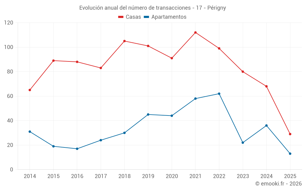 El precio mediano en las 33 transacciones de apartamentos de los últimos 12 meses en la comuna de Périgny fue de 3 976 € por metro cuadrado para un valor patrimonial medio de 217 000 €. Durante este período el 60% de las transacciones estuvieron entre 3 586 y 4 418 € por metro cuadrado (del 2º al 8º decil).
