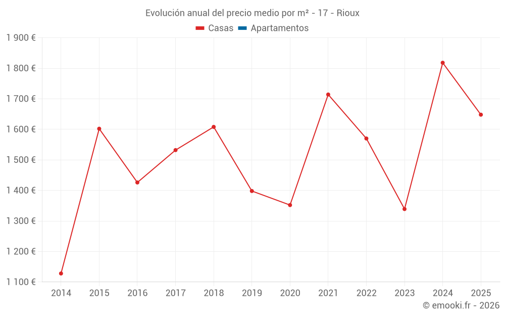 El precio mediano en las 24 transacciones de casas de los últimos 24 meses en la comuna de Rioux fue de 1 584 € por metro cuadrado para un valor patrimonial medio de 200 000 €. Durante este período el 60% de las transacciones estuvieron entre 838 y 2 049 € por metro cuadrado (del 2º al 8º decil).