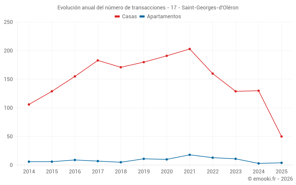 El precio mediano en las 50 transacciones de casas de los últimos 6 meses en la comuna de Saint-Georges-d'Oléron fue de 3 386 € por metro cuadrado para un valor patrimonial medio de 229 518 €. Durante este período el 60% de las transacciones estuvieron entre 2 536 y 4 555 € por metro cuadrado (del 2º al 8º decil).