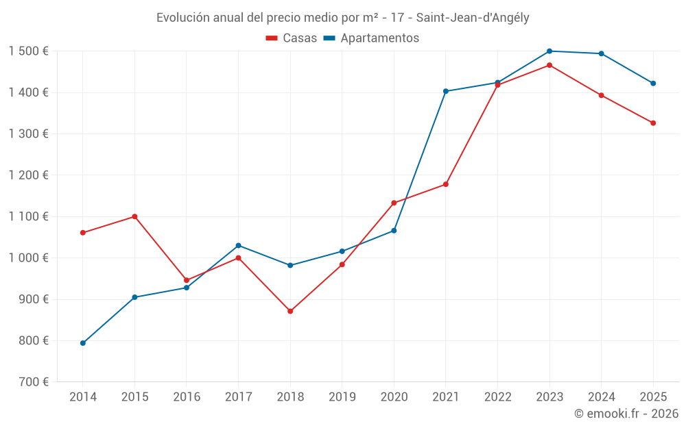 El precio mediano en las 42 transacciones de casas de los últimos 6 meses en la comuna de Saint-Jean-d'Angély fue de 1 326 € por metro cuadrado para un valor patrimonial medio de 135 000 €. Durante este período el 60% de las transacciones estuvieron entre 1 118 y 1 678 € por metro cuadrado (del 2º al 8º decil).
