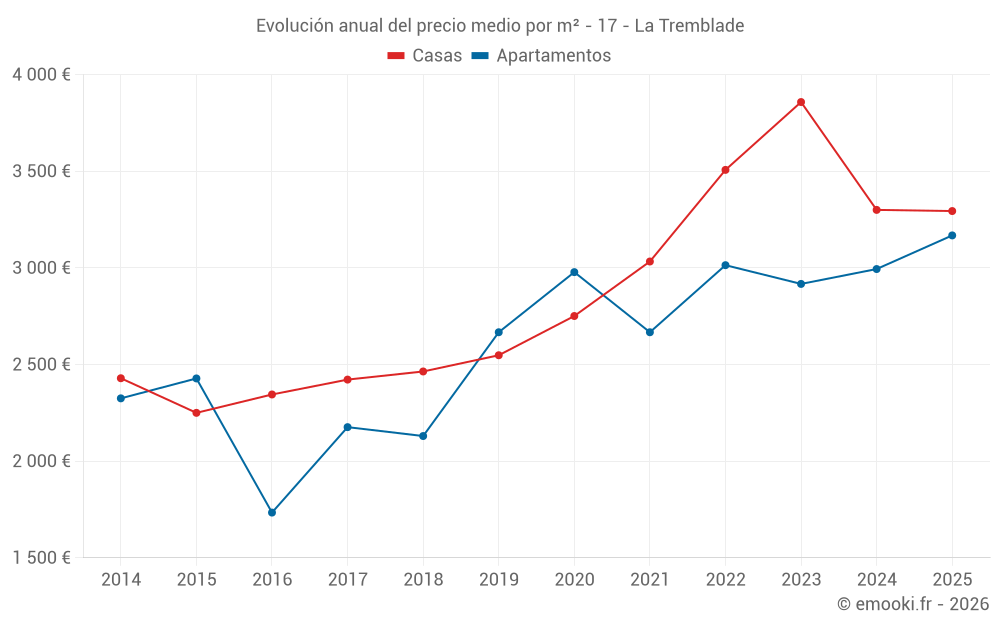 El precio mediano en las 43 transacciones de casas de los últimos 6 meses en la comuna de La Tremblade fue de 3 294 € por metro cuadrado para un valor patrimonial medio de 242 718 €. Durante este período el 60% de las transacciones estuvieron entre 2 216 y 4 100 € por metro cuadrado (del 2º al 8º decil).