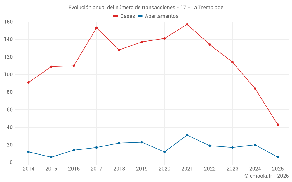 El precio mediano en las 19 transacciones de apartamentos de los últimos 12 meses en la comuna de La Tremblade fue de 3 271 € por metro cuadrado para un valor patrimonial medio de 140 000 €. Durante este período el 60% de las transacciones estuvieron entre 2 219 y 4 036 € por metro cuadrado (del 2º al 8º decil).
