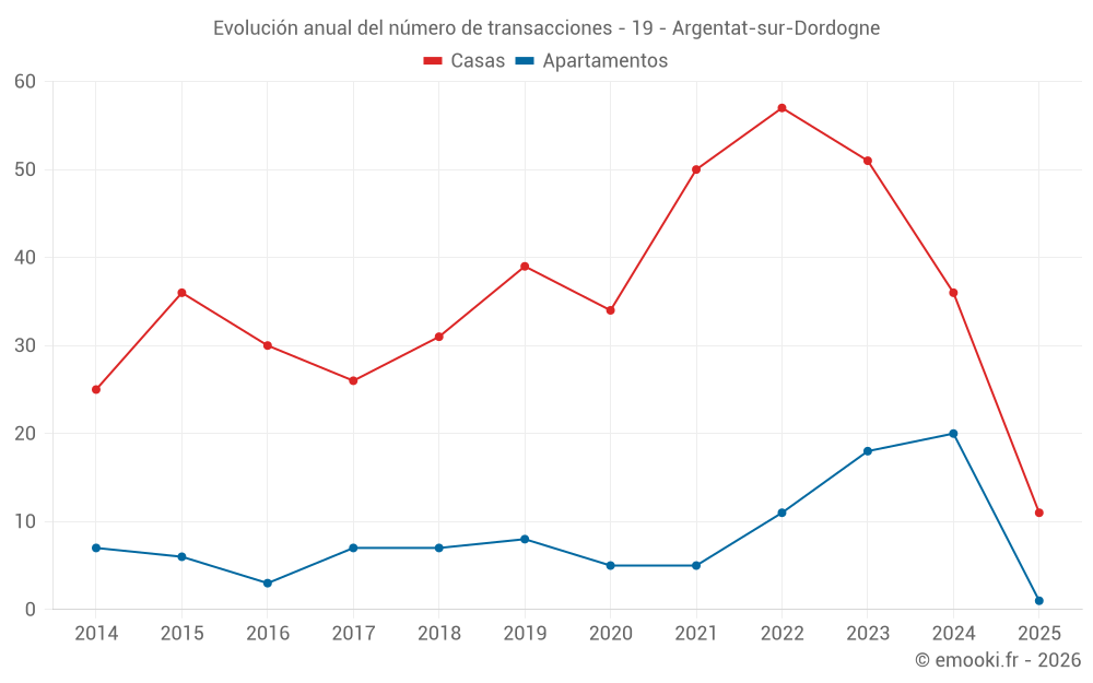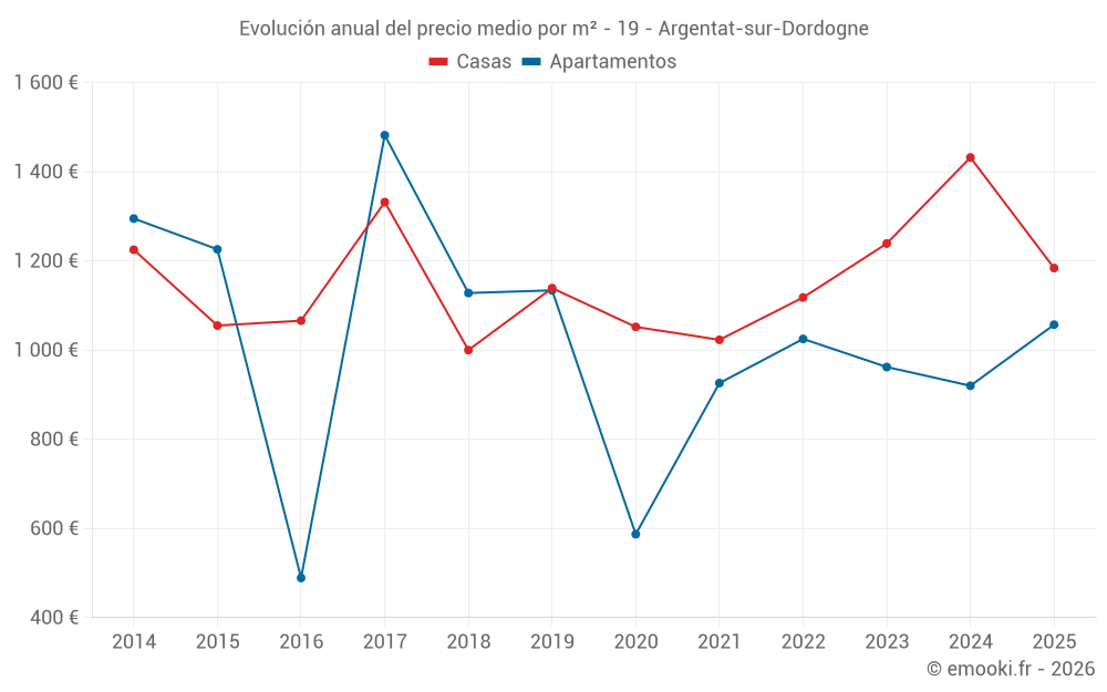 El precio mediano en las 34 transacciones de apartamentos de los últimos 24 meses en la comuna de Argentat-sur-Dordogne fue de 948 € por metro cuadrado para un valor patrimonial medio de 35 500 €. Durante este período el 60% de las transacciones estuvieron entre 767 y 1 098 € por metro cuadrado (del 2º al 8º decil).