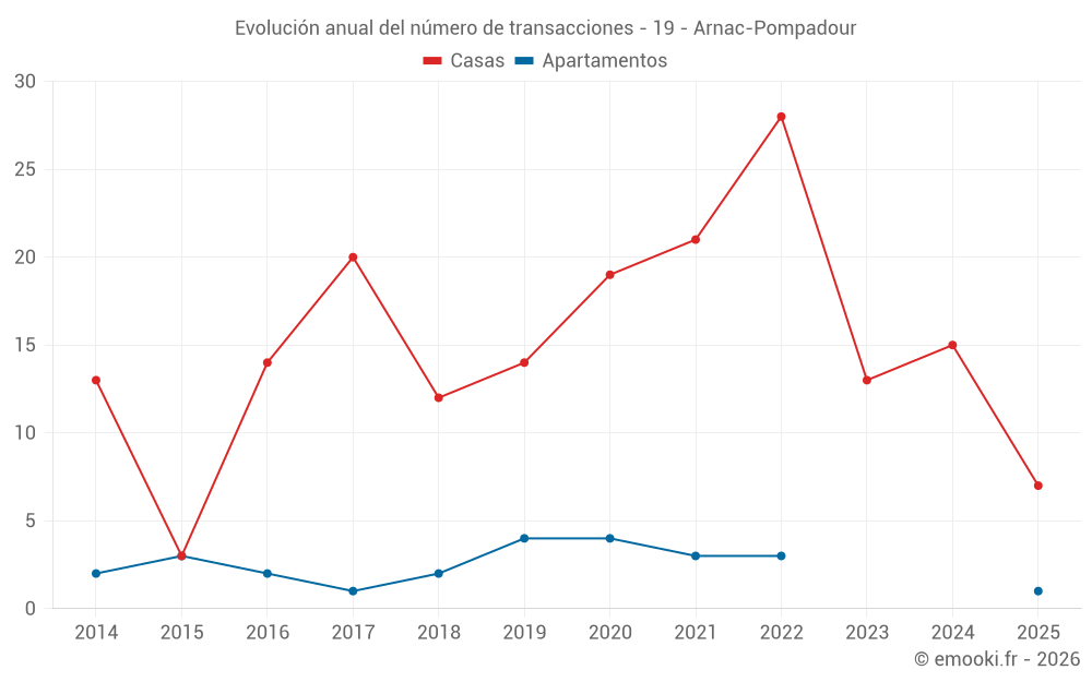 El precio mediano en las 16 transacciones de casas de los últimos 12 meses en la comuna de Arnac-Pompadour fue de 932 € por metro cuadrado para un valor patrimonial medio de 92 000 €. Durante este período el 60% de las transacciones estuvieron entre 879 y 1 459 € por metro cuadrado (del 2º al 8º decil).